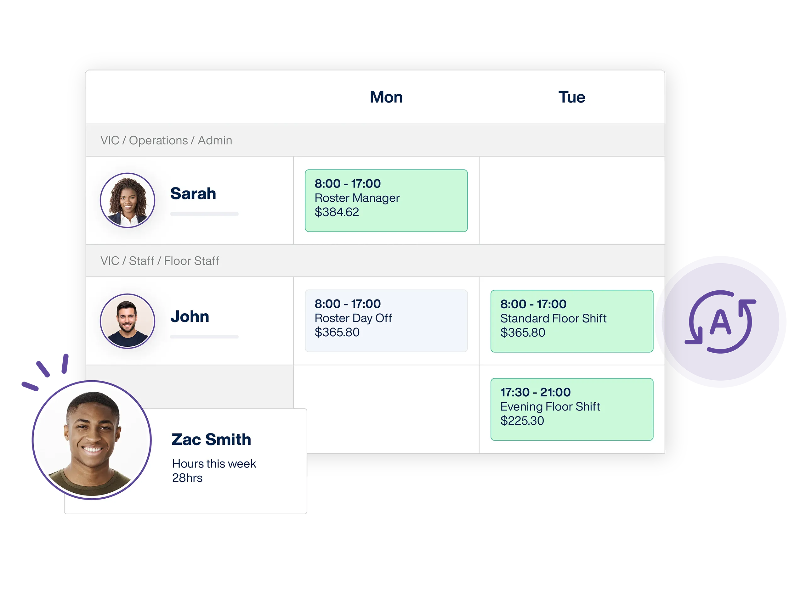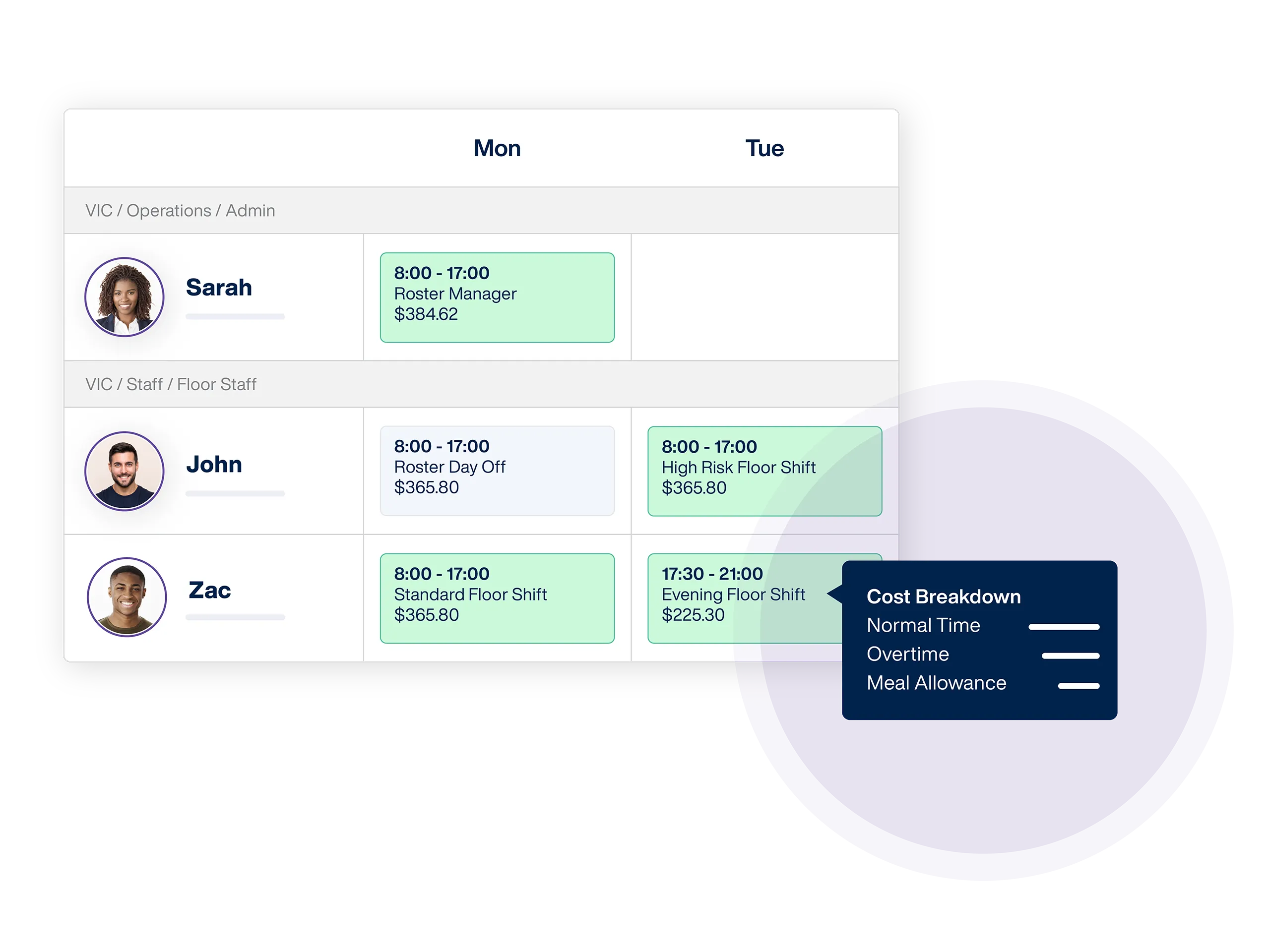 See award-interpreted costs instantly when hovering over a shift, allowing proactive and cost-effective decisions as you build rosters.