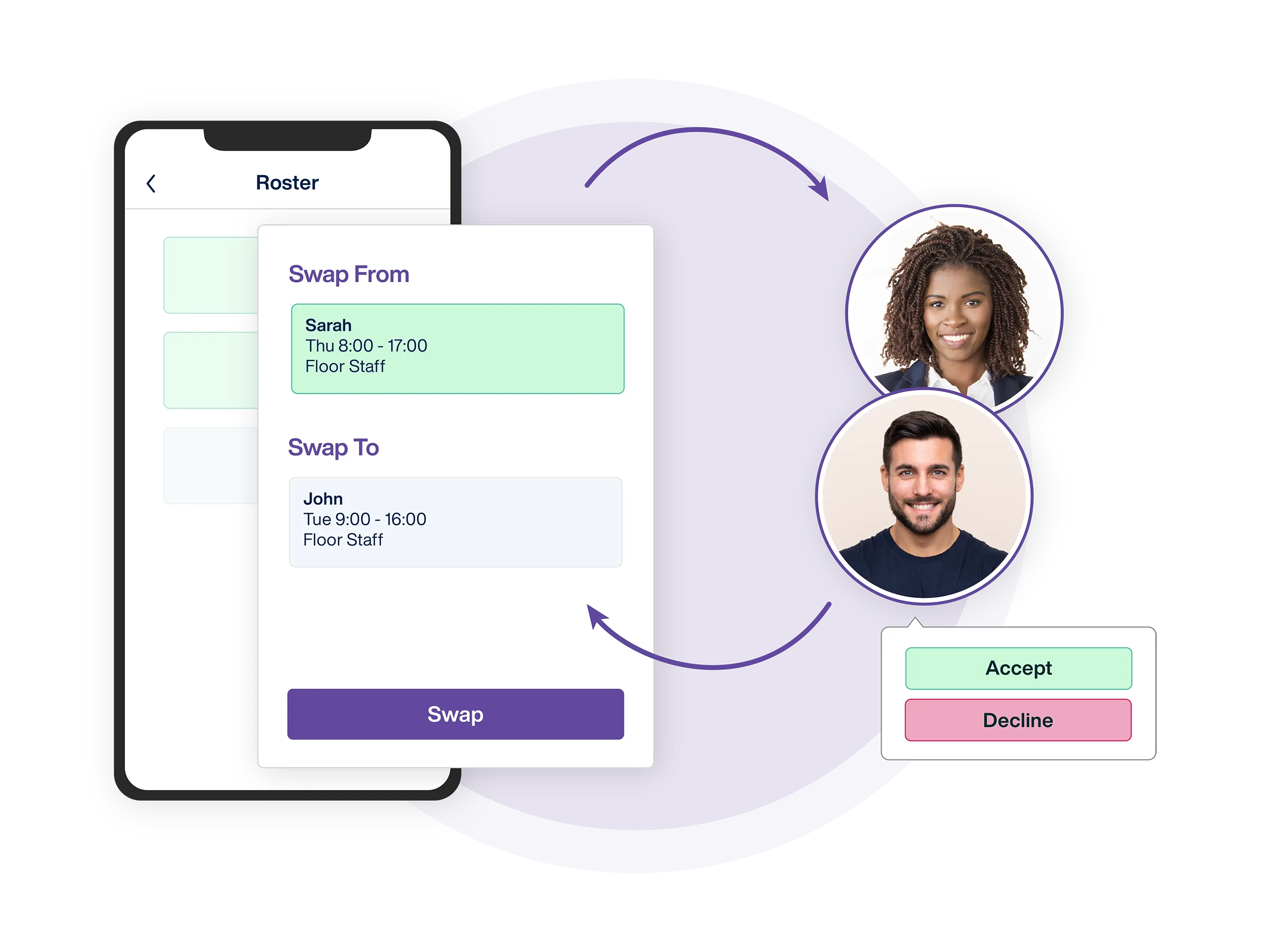 Mobile shift swapping that stays fully compliant — let staff swap shifts with optional approvals, overtime rules, and cost controls.